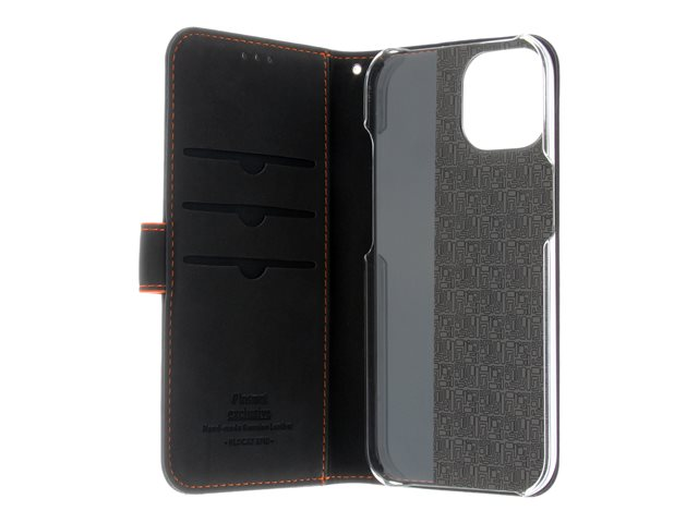 Insmat Exclusive - Läppäkansi matkapuhelimelle - aito nahka, polykarbonaatti, kartonki + paperi + alumiinifolio - musta, oranssi malleihin Apple iPhone 15 650-3192