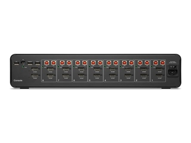 | Liitännät | 16 x DisplayPort/HDMI-tulo 2 x DisplayPort/HDMI-lähtö 8 x näppäimistö (USB)/hiiri(USB) Type B 1 x näppäimistö (USB) Type A 1 x hiiri (USB) Type A 1 x audiolähtö miniliitin 8 x audiotulo miniliitin 8 x USB 2.0 Type B common access card (CAC) 1 x USB 2.0 Type A common access card (CAC) 1 x hallinto RJ-25 |